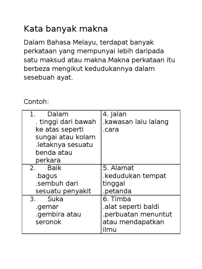 Makna perkataan yang berbagai-bagai ini dibezakan dalam konteks ayat yang berlainan. Kata banyak makna bermaksud sesuatu perkataan itu mempunyai beberapa makna yang berlainan mengikut ayat dan konteks yang diberi. Pages 21 Ratings 100 1 1 out of 1 people found this document helpful.